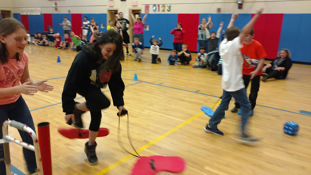 Involves hands on learning about different disabilities. Individuals divide into red and blue teams and line up on sides of room. We go down the line allowing as many people to participate as possible. Teams race against each other while sidelines cheer on teammates. Challenges are based on actual disabled people. Team participation and good sportsmanship are very important messages stressed in these events.
